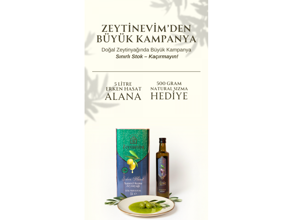 5 Litre Erken Hasat siparişinizde, mutfağınızın pratik yardımcısı olacak 500 Gr Natürel Sızma Zeytinyağı size özel hediyemiz!