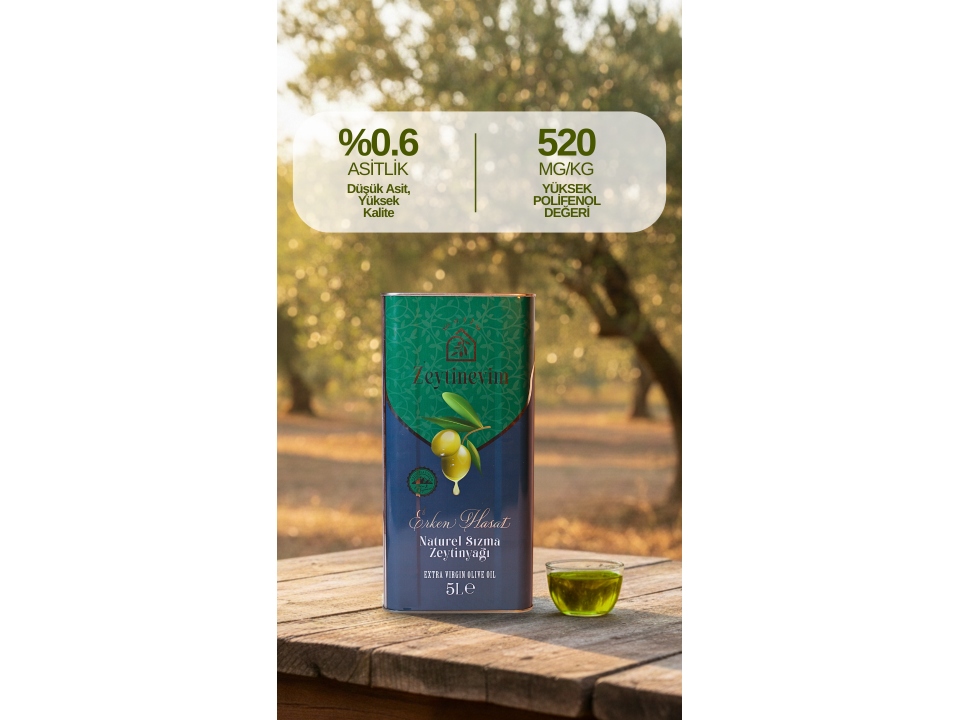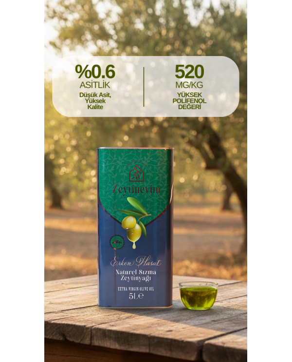 Edremit kazdağları bölgesinin zeytinlerinden katkısız olarak üretilen Erken Hasat Natürel Sızma Zeytinyağımız bağımsız laboratuvarlarda yaptırdığımız testlerde 0,6 gibi düşük bir asit oranına ve 520 Mg/Kg yüksek polifenol oranına sahiptir; özenle seçilen zeytinlerden elde edilen, en yüksek kalitede zeytinyağı deneyimini sunar. Yoğun aroması ve zengin besin değerleriyle sofralarınıza sağlık ve lezzet katar. Erken hasat edilen zeytinler, düşük asit oranı ve taze, meyvemsi tadıyla öne çıkar. Yemeklerinizde, salatalarınızda ve kahvaltılarınızda kullanabileceğiniz bu eşsiz ürün, doğal ve katkısızdır.